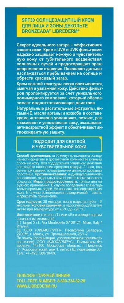LIBREDERM BRONZEADA крем для лица и зоны декольте солнцезащитный SPF30, 50 мл, Беларусь информация: