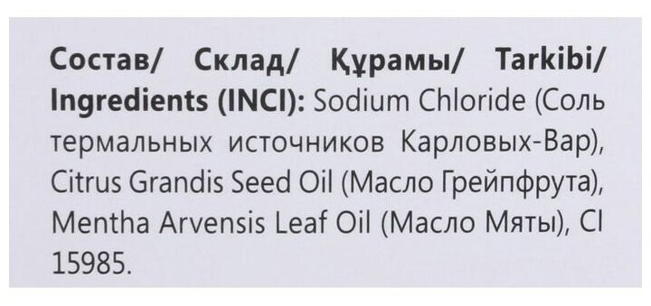 | Состав | Sodium Chloride, Citrus grandis oil , Mentha Arvensis Leaf Oil, Cl 15985. |