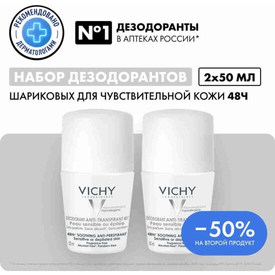 10 цен на Дезодорант шариковый Vichy для чувствительной кожи, 48ч, 50 мл х2 шт (промо)