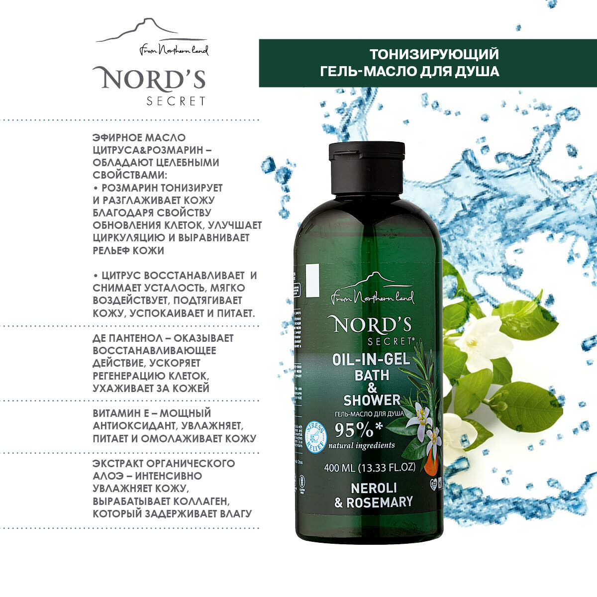 NORDS SECRET Гель-масло для душа "Цветок нероли и розмарин" тонизирующий, 400 мл информация:
