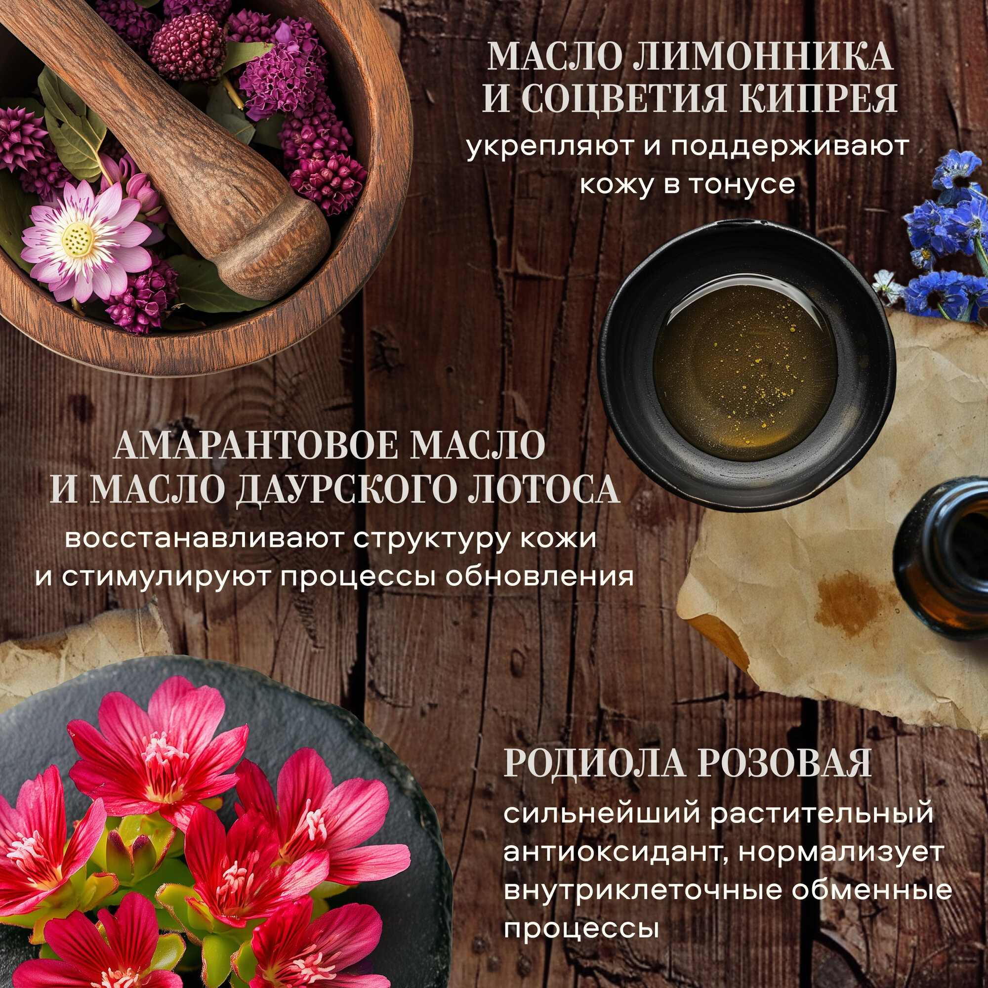 | Масла и эссенции | масло амаранта / масло лимонника / экстракт лотоса / экстракт родиолы розовой |