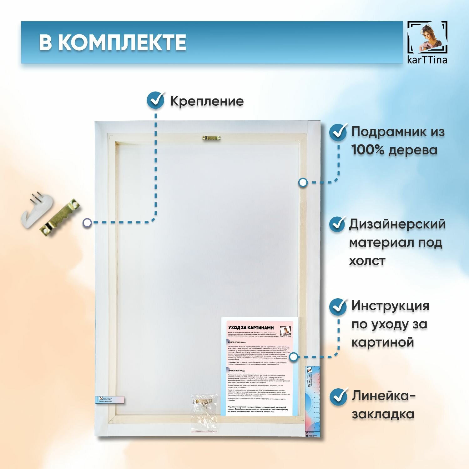 | Комплектация | Картина 50х70см 1 шт.; Инструкция 1 шт.; Крепление 1 шт.; Линейка-закладка 1 шт. |