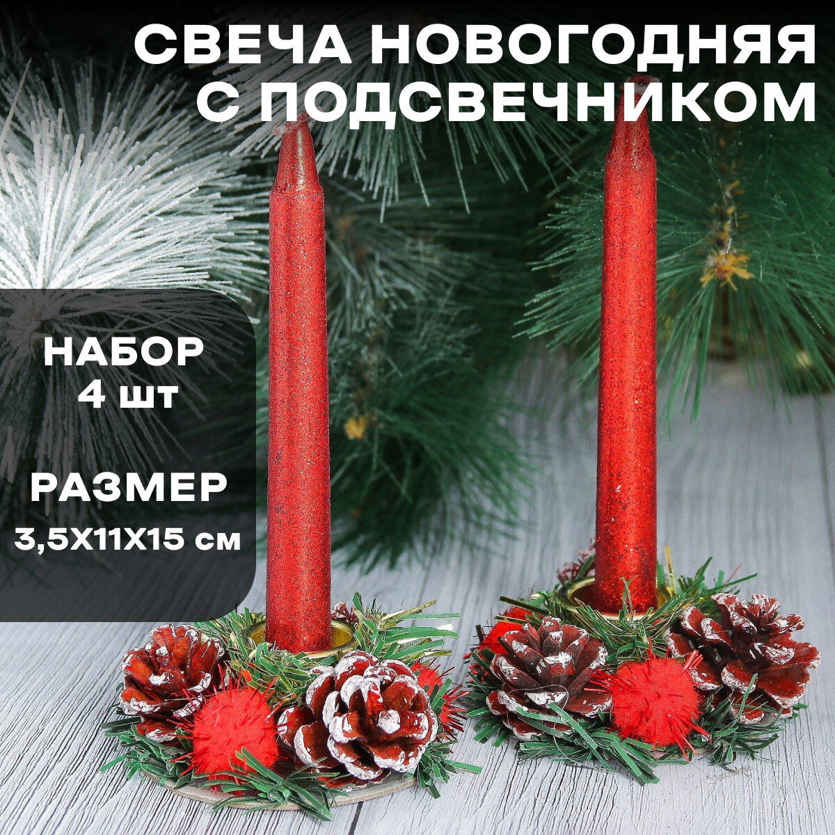 Новогодние свечи с подсвечником "Красный блеск" (набор 4 шт) 3,5*11*15 см 2371410