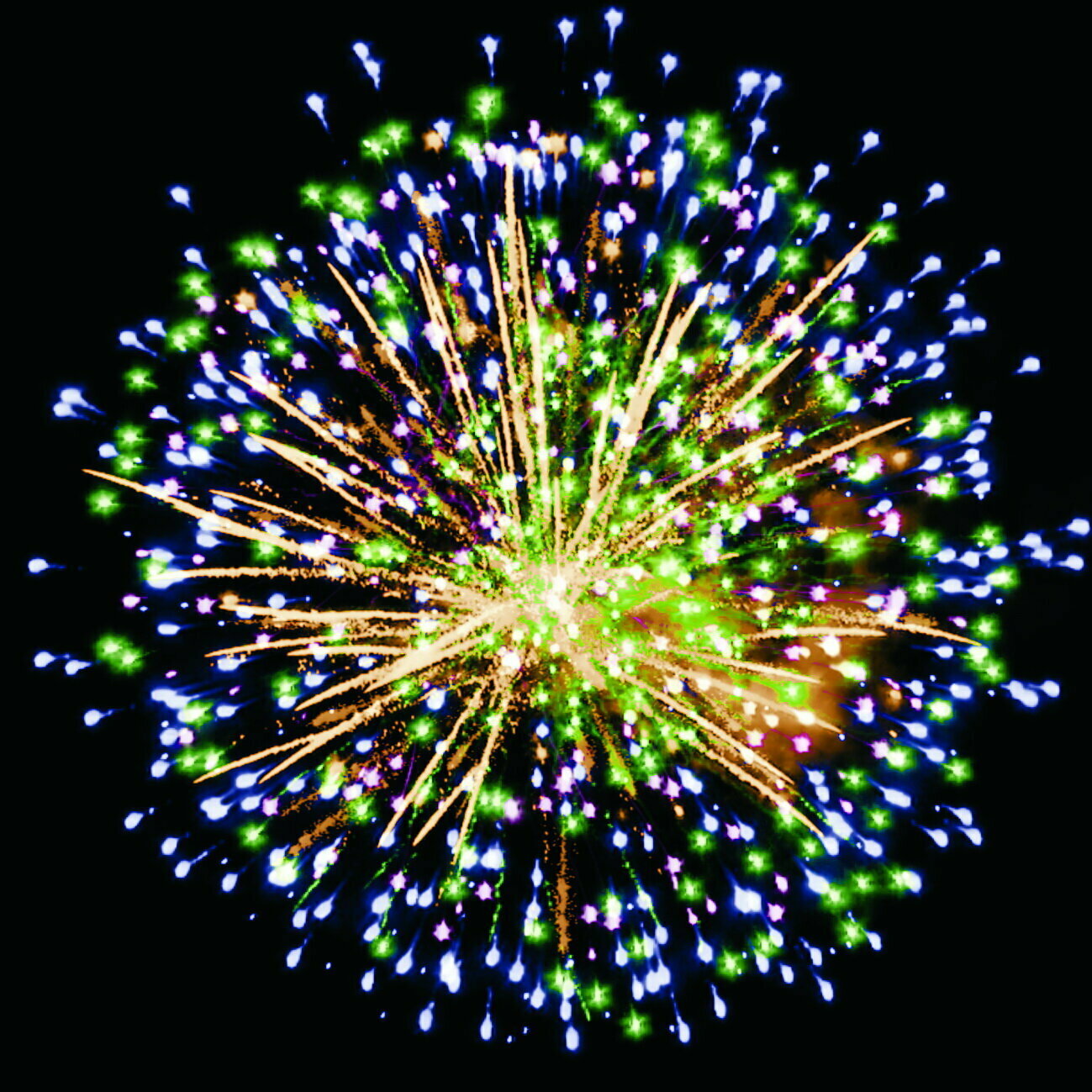 | Эффекты | Разноцветные кометы разрываются сферами из: 1. серебряных форсов / синих и зелёных мерцающих огней; 2. серебряных форсов с красными / зелёными огнями на концах / фиолетовых и синих огней / множества трещащих серебряных искр; 3. золотых форсов с трещащими мерцающими искрами / оранжевых и золотых мерцающих огней; 4-5. золотых форсов с мерцающими красными / зелёными искрами и синих огней; 6. золотых форсов / фиолетовых / зелёных и синих огней; 7. золотых форсов с трещащими искрами и красных мерцающих огней. |