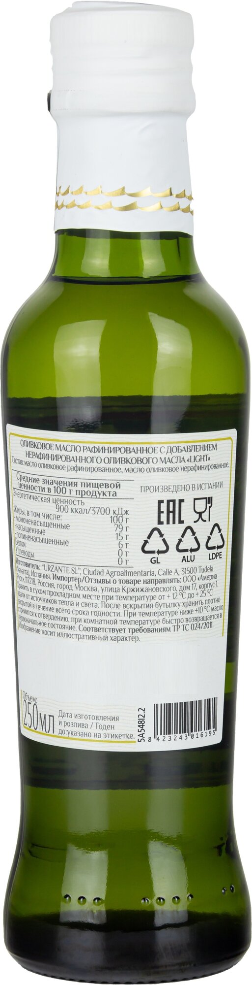 Оливковое масло Urzante рафинированное с добавлением нерафинированного оливкового масла light 100%, 0,25 л информация: