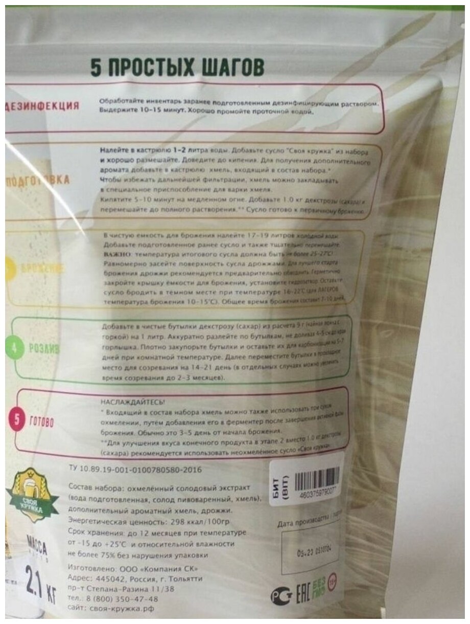| Состав | Солодовый экстракт 2,1 кг; дополнительный ароматный Хмель Ранний Московский; Дрожжи верхового брожения ТМ "Своя Кружка" А-05. |