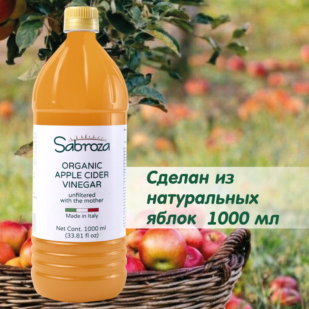 Яблочный Уксус, 1 литр, Натуральный Нефильтрованный и не пастеризованный,Sabroza, Италия, c уксусной маткой, ПЭТ информация: