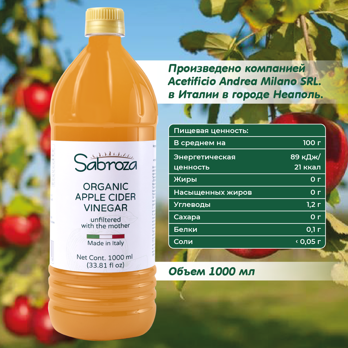 10 цен на Яблочный Уксус, 1 литр, Натуральный Нефильтрованный и не пастеризованный,Sabroza, Италия, c уксусной маткой, ПЭТ