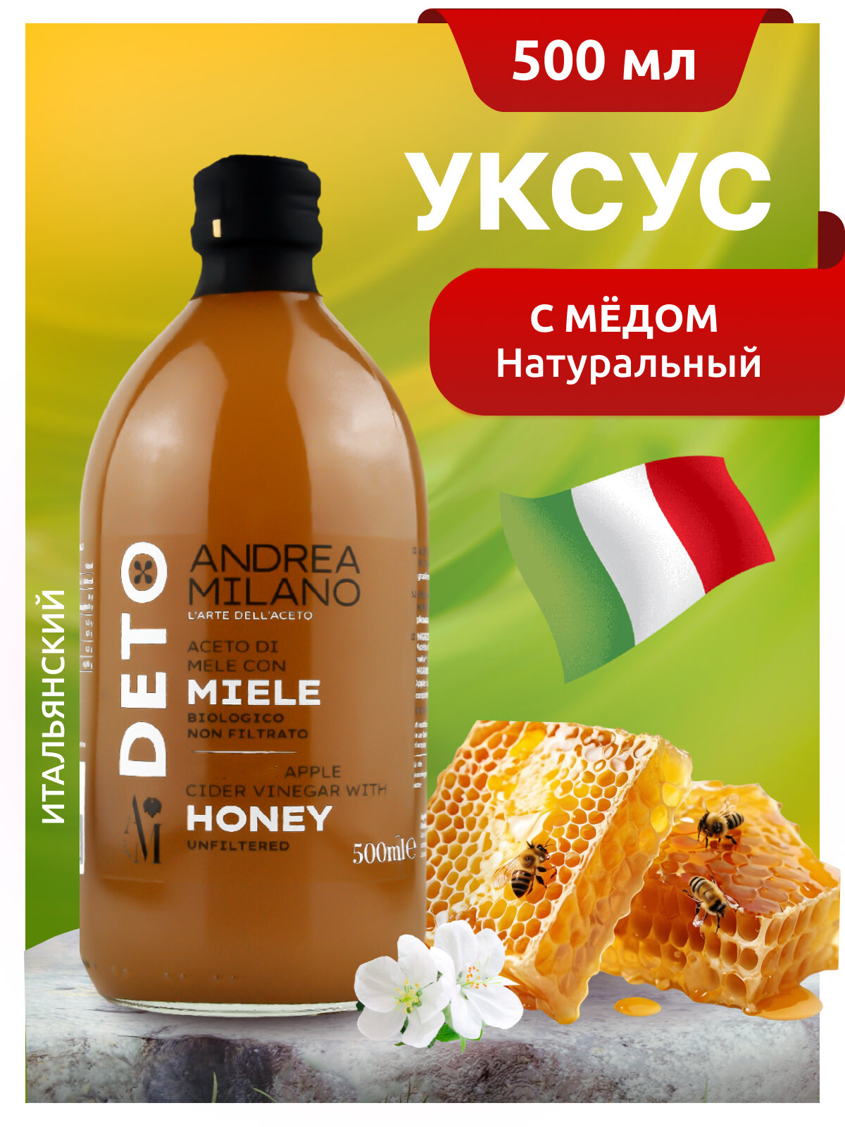 Отзывы на Уксус яблочный натуральный с мёдом нефильт. "DETO ANDREA MILANO" 500 мл ст/б (Италия)