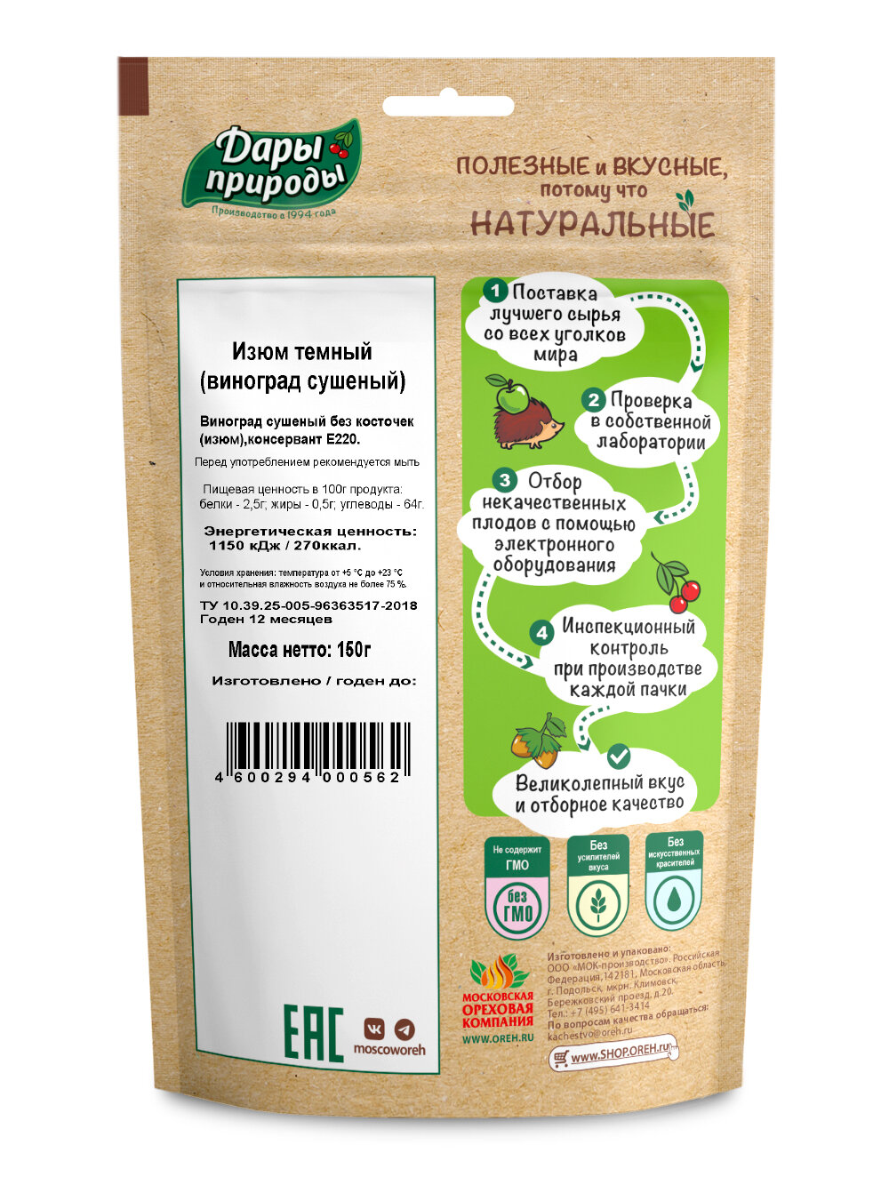 Изюм Дары природы виноград темный сушеный крупный из Чили, 150 г информация: