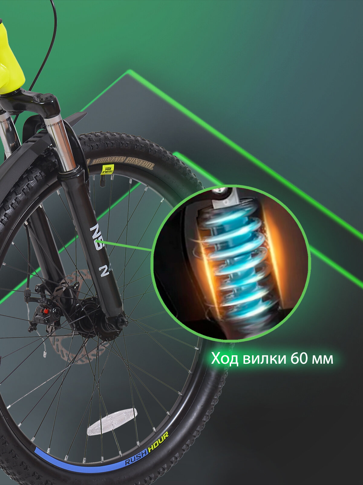 Велосипед горный дисковый 26" рост 140-155см 7 скоростей желтый рама 14" велик 8 лет 9 лет 10 лет переключатель SHIMANO скоростной RUSH HOUR NX 605 22 390 ₽