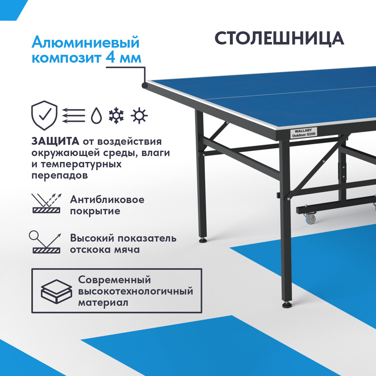 Теннисный стол всепогодный уличный Wallaby Outdoor S200 outdoor 4mm (blue), складной игровой стол для пинг понга (тенниса) для улицы всесезонный информация: