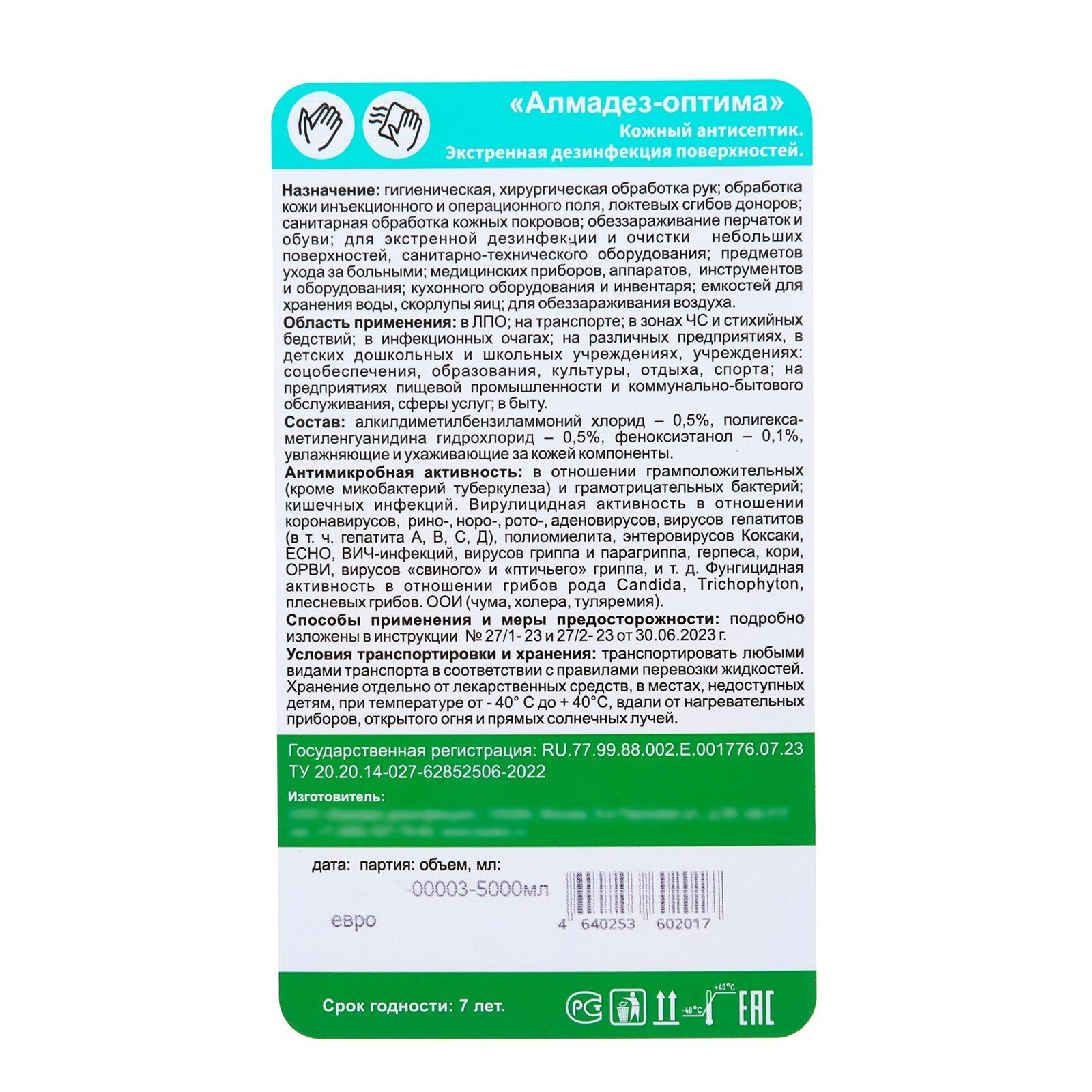 | Основное действующее вещество | алкилдиметилбензиламмоний хлорид (АДБАХ) / полигексаметиленгуанидин гидрохлорид |