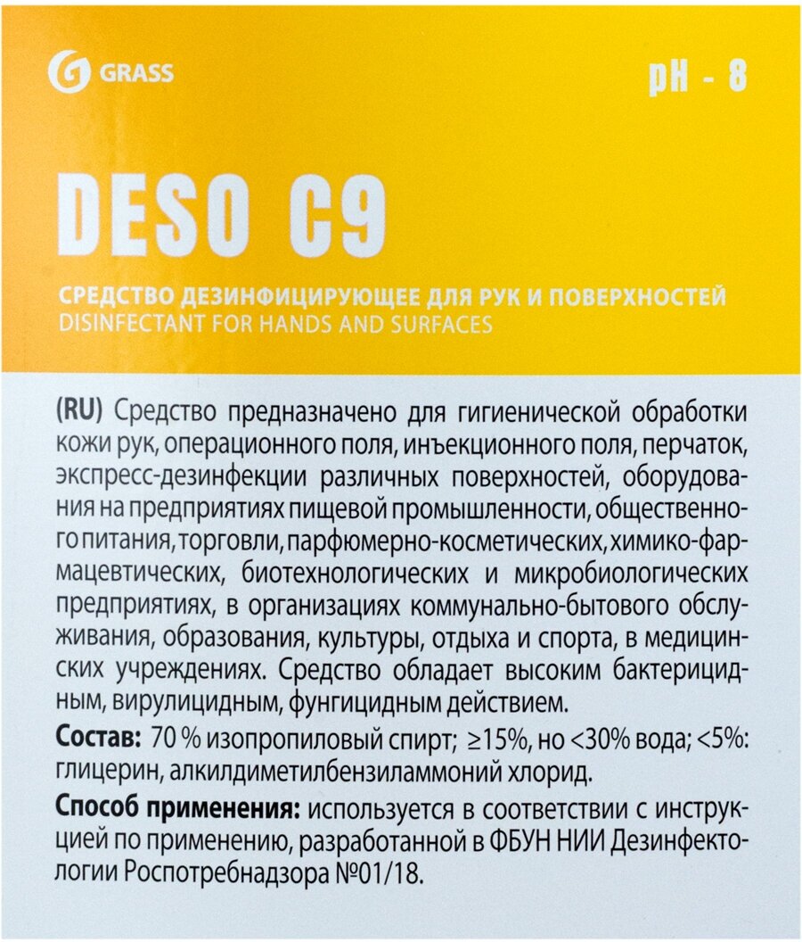 10 цен на Антисептик кожный дезинфицирующий спиртосодержащий (70%) 5 л GRASS DESO C9, готовый раствор