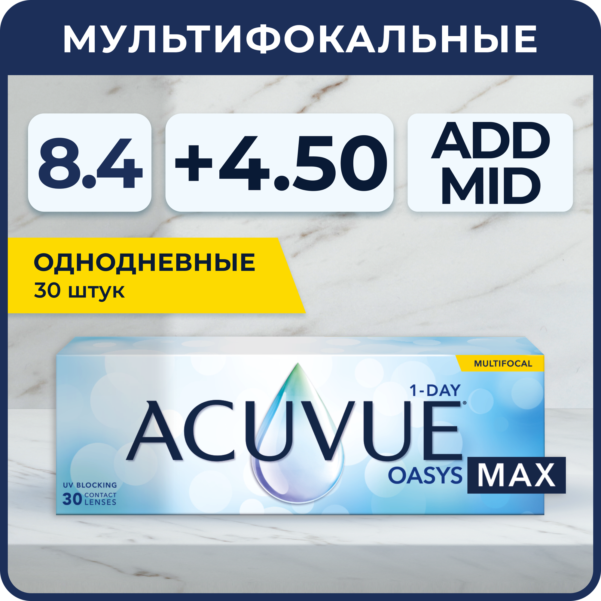 Мультифокальные линзы ACUVUE Oasys Max 1-day Multifocal (30 линз) R 8.4 SPH +4.50 Аддидация MID, однодневные, прозрачные информация: