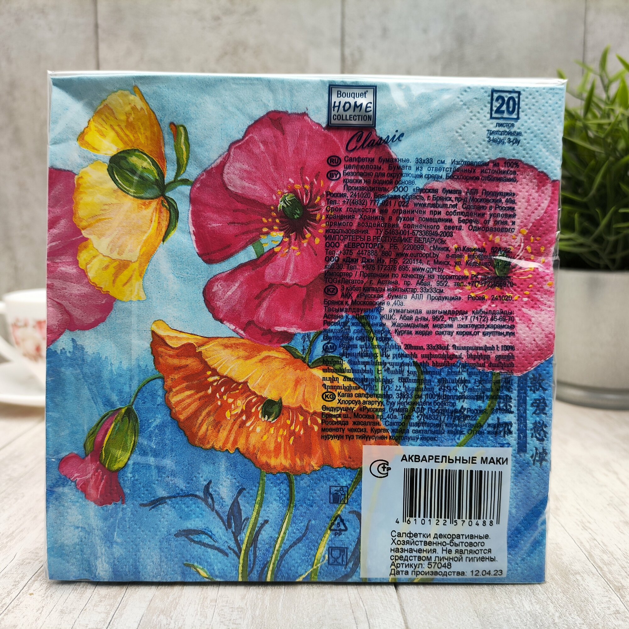 10 цен на Салфетки бумажные Bouquet “Акварельные маки” 1 упаковка по 20 штук, размер 33х33 сантиметра, 3-х слойные.