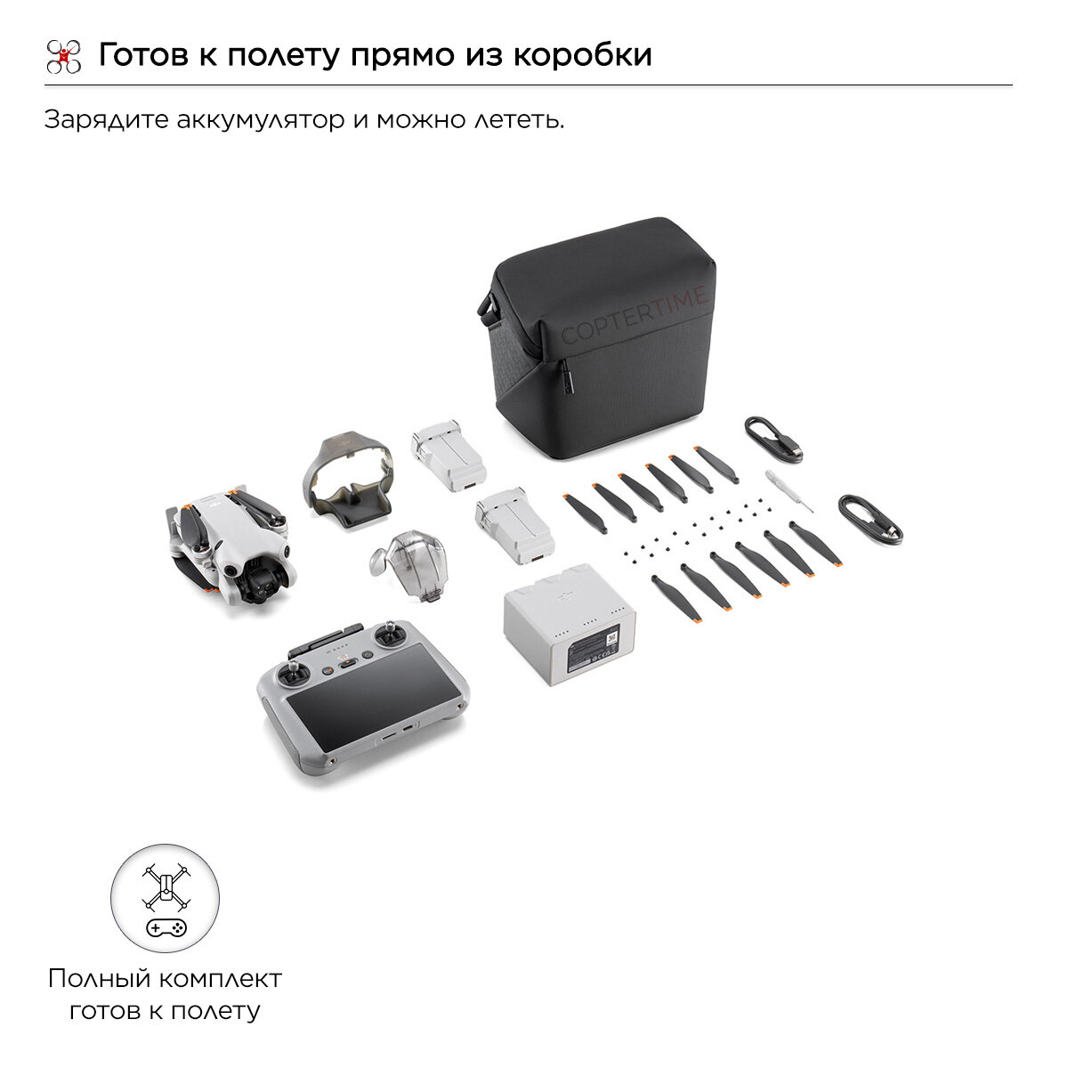 | Комплектация | DJI Mini 4 Pro × 1; Пульт DJI RC 2 × 1; Защитный стабилизатор × 1; Интеллектуальная летная батарея увеличенной емкости × 3; Держатель пропеллеров × 1; Отвертка × 1; Винты × 18; Сумка для переноски × 1; Запасные пропеллеры (пара) × 3; Двухсторонний зарядный концентратор × 1; Кабель PD от типа C к типу C × 1; Кабель USB-C × 1 |