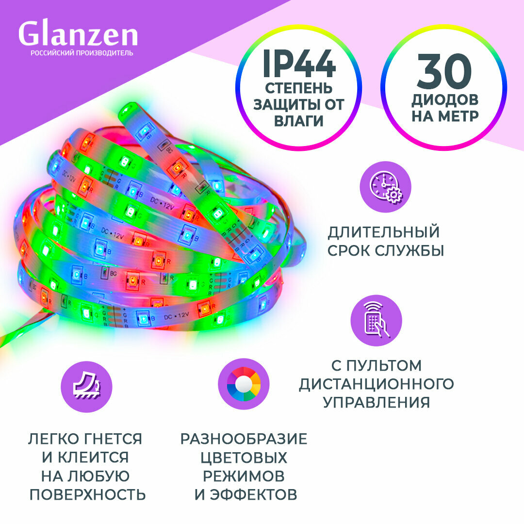 Светодиодная RGB лента-гирлянда led подсветка 5 м 25 Вт GLANZEN LSL-0025-05-RGB-L c пультом управления информация: