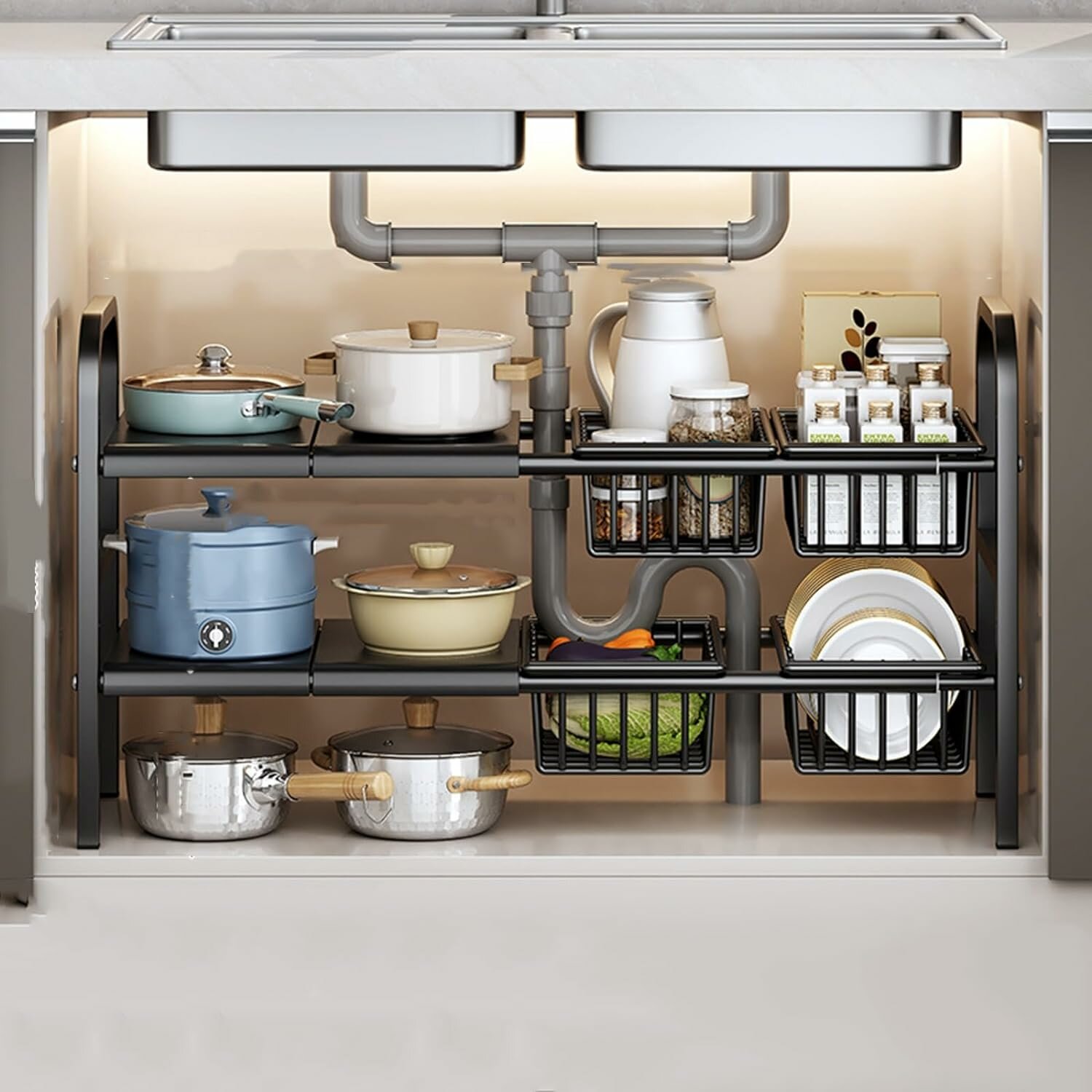 Отзывы на Органайзер под раковиной — выдвижная кухонная полка для хранения под раковиной двухъярусная 4 полки 4 корзины, черная