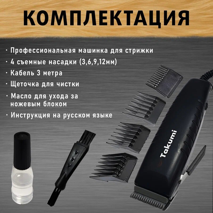 Профессиональная машинка для стрижки животных, кошек и собак всех пород Takumi 3500 с вибрационным двигателем (15 Ватт, 3000 об./мин) + 4 насадки информация: