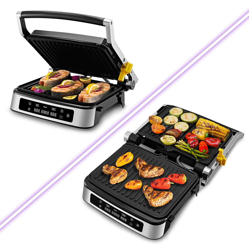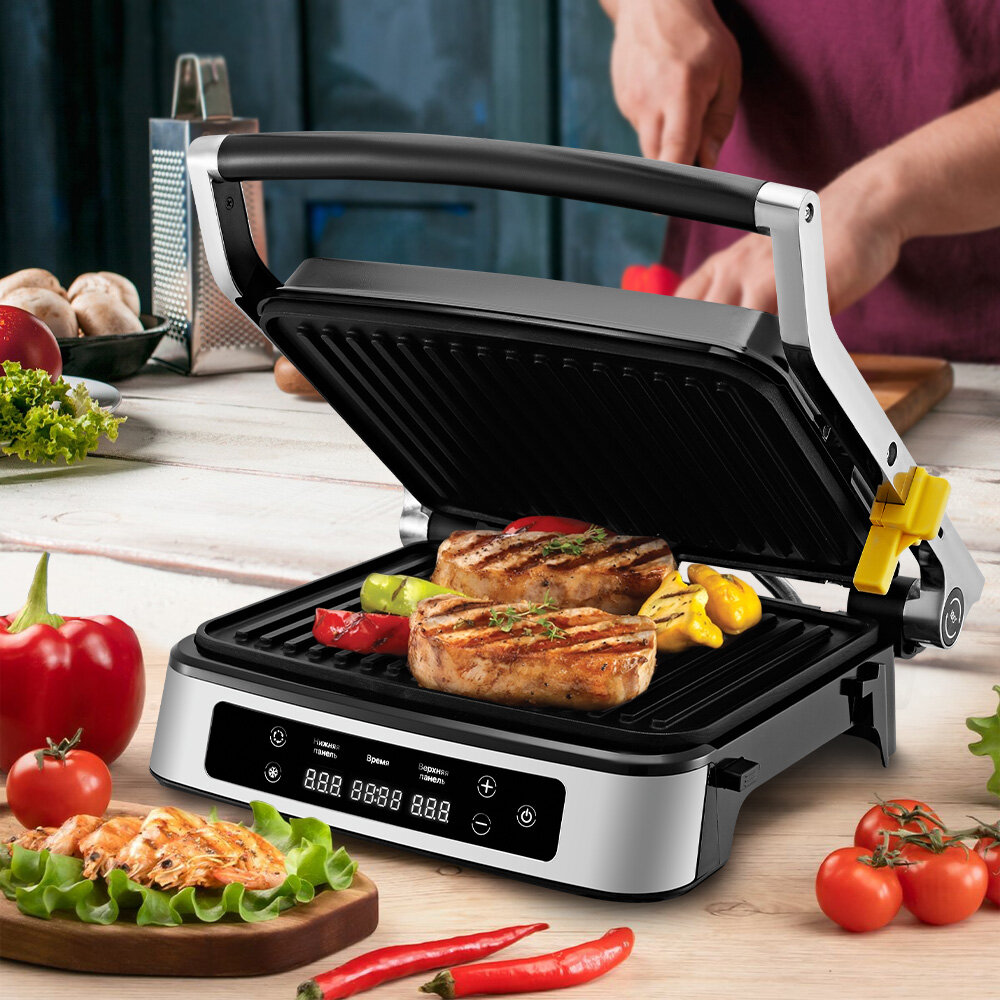 | Особенности | антипригарное покрытие / контактный гриль / поддон для сбора жира / регулировка высоты верхней панели / съемные пластины |