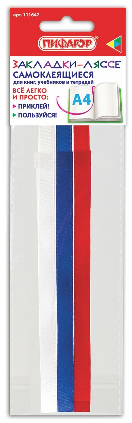 Закладки-ляссе "триколор" для книг А4 (длина 38 см) пифагор, клейкий край, 3 ленты, 111647 информация: