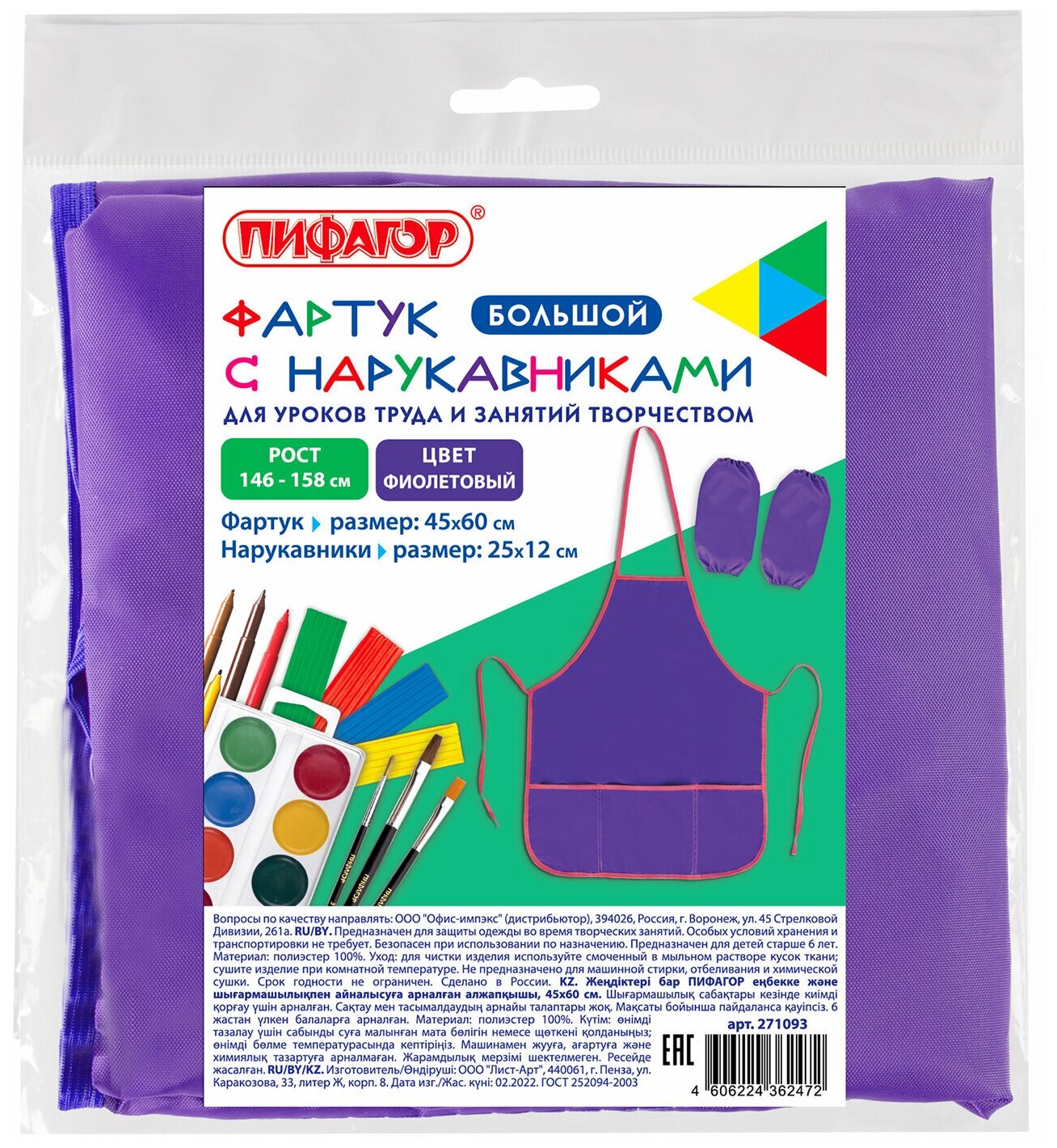 10 цен на Фартук с нарукавниками для уроков труда пифагор, 3 кармана, увеличенный размер, 45х60 см, фиолетовый, 271093 (арт. 271093)