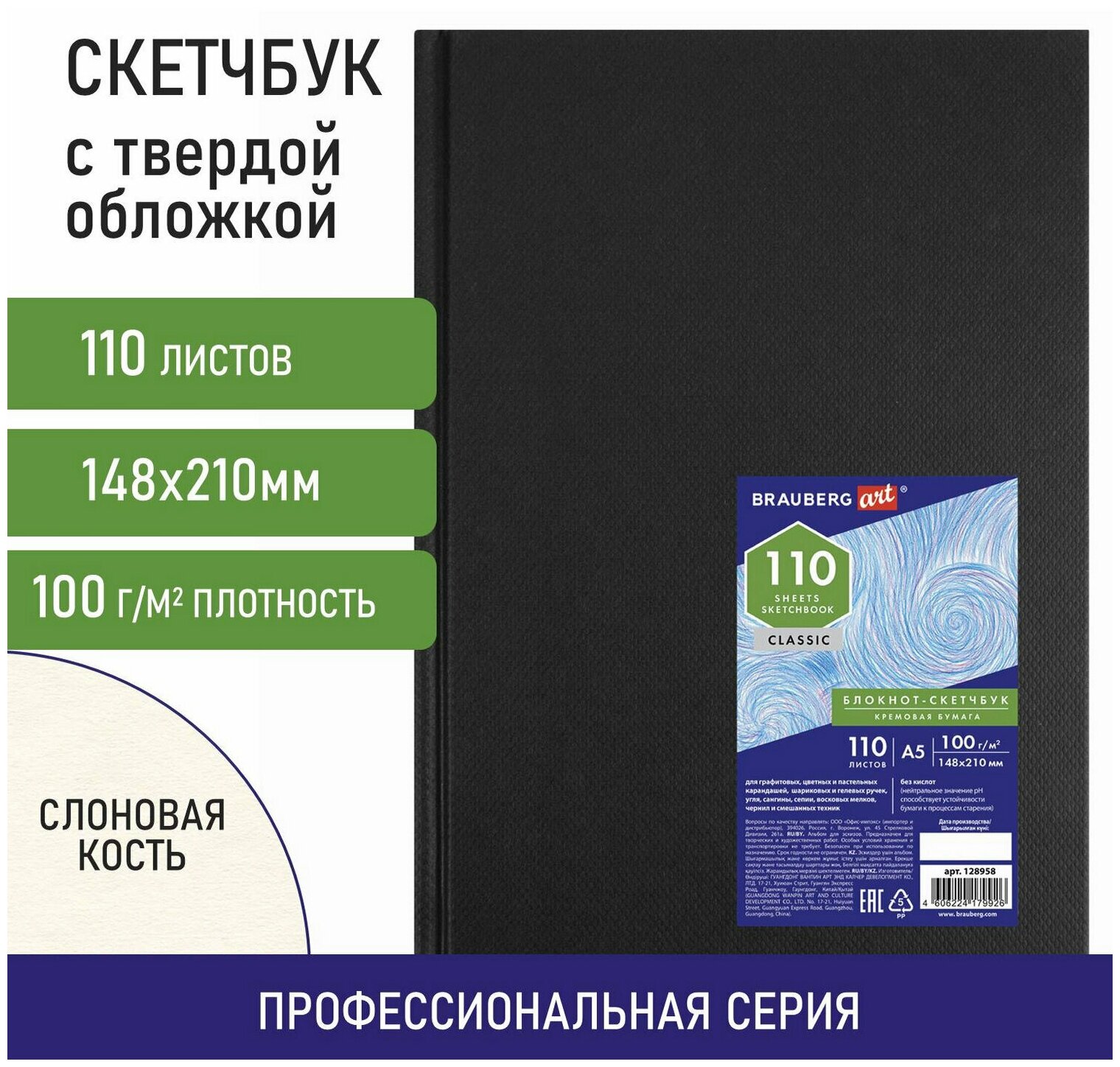 Блокнот-Скетчбук для рисования эскизов, страницы цвета слоновая кость 100 г/м2, 210х148 мм, 110 л., книжный твердый переплет, BRAUBERG ART CLASSIC
