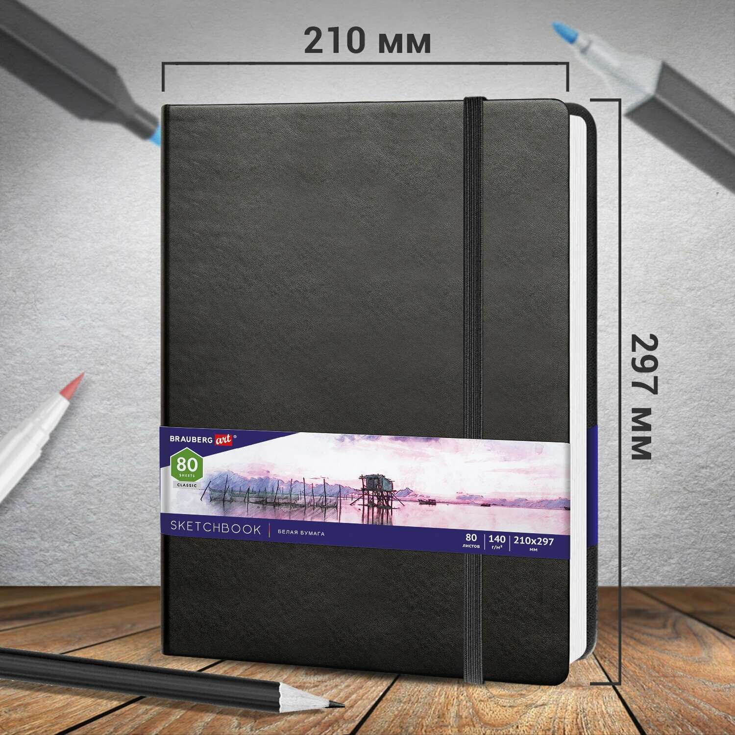 10 цен на Скетчбук, белая бумага 140г/м 210х297мм, 80л, кожзам, резинка, BRAUBERG ART CLASSIC, черный, 113184