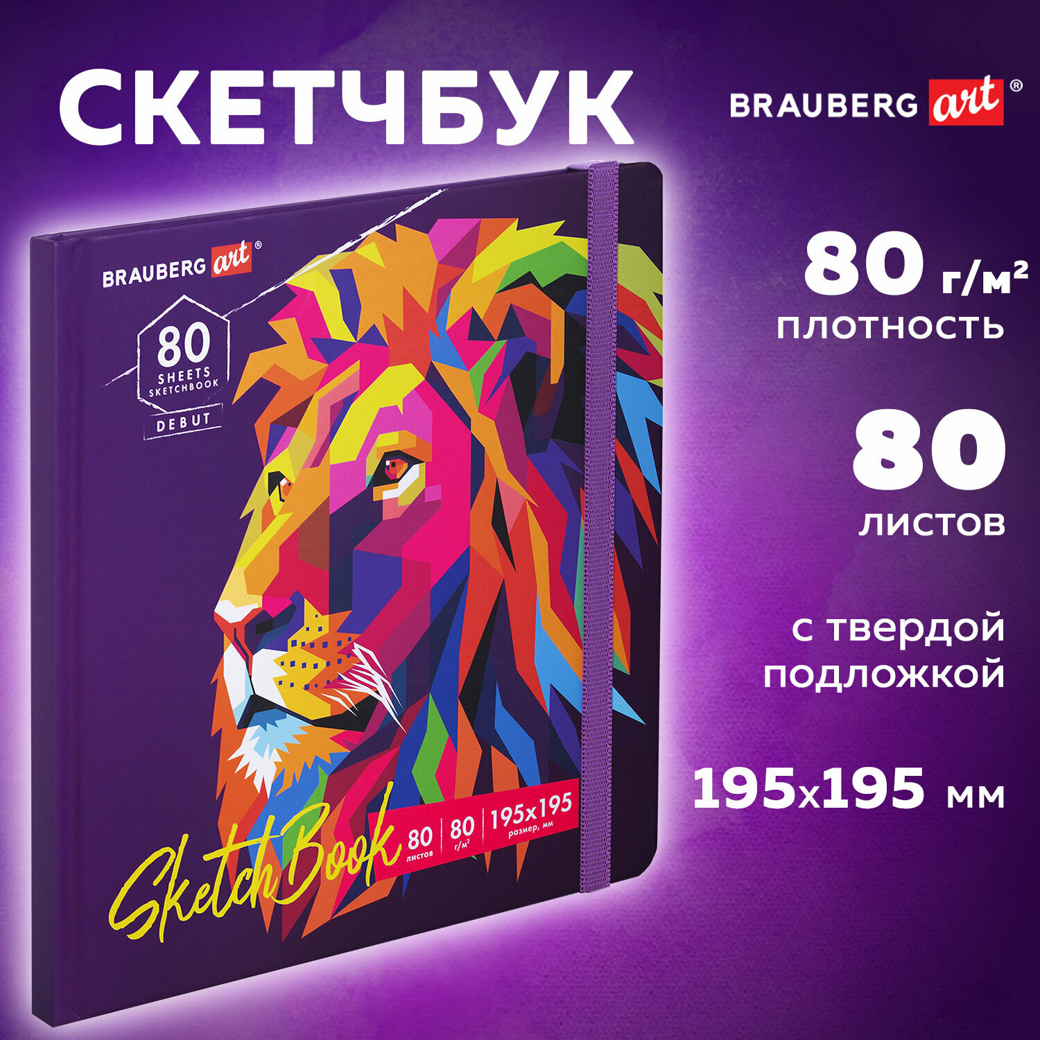 Блокнот-Скетчбук с белыми страницами для рисования эскизов 80 г/м2, 195х195 мм, 80 листов, резинка, твердый, Brauberg Art Classic Лев, 114582 информация: