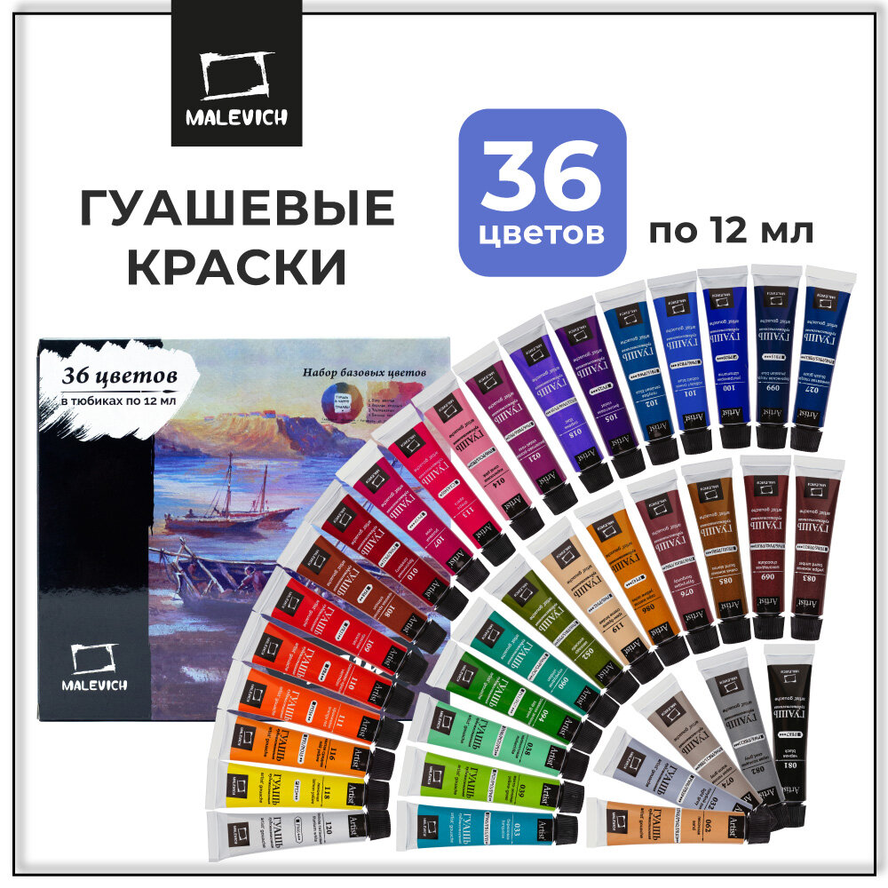 Гуашь художественная Малевичъ, набор гуаши в тюбиках, базовые цвета, 12 мл, гуашевые краски 36 цветов, 620045 информация: