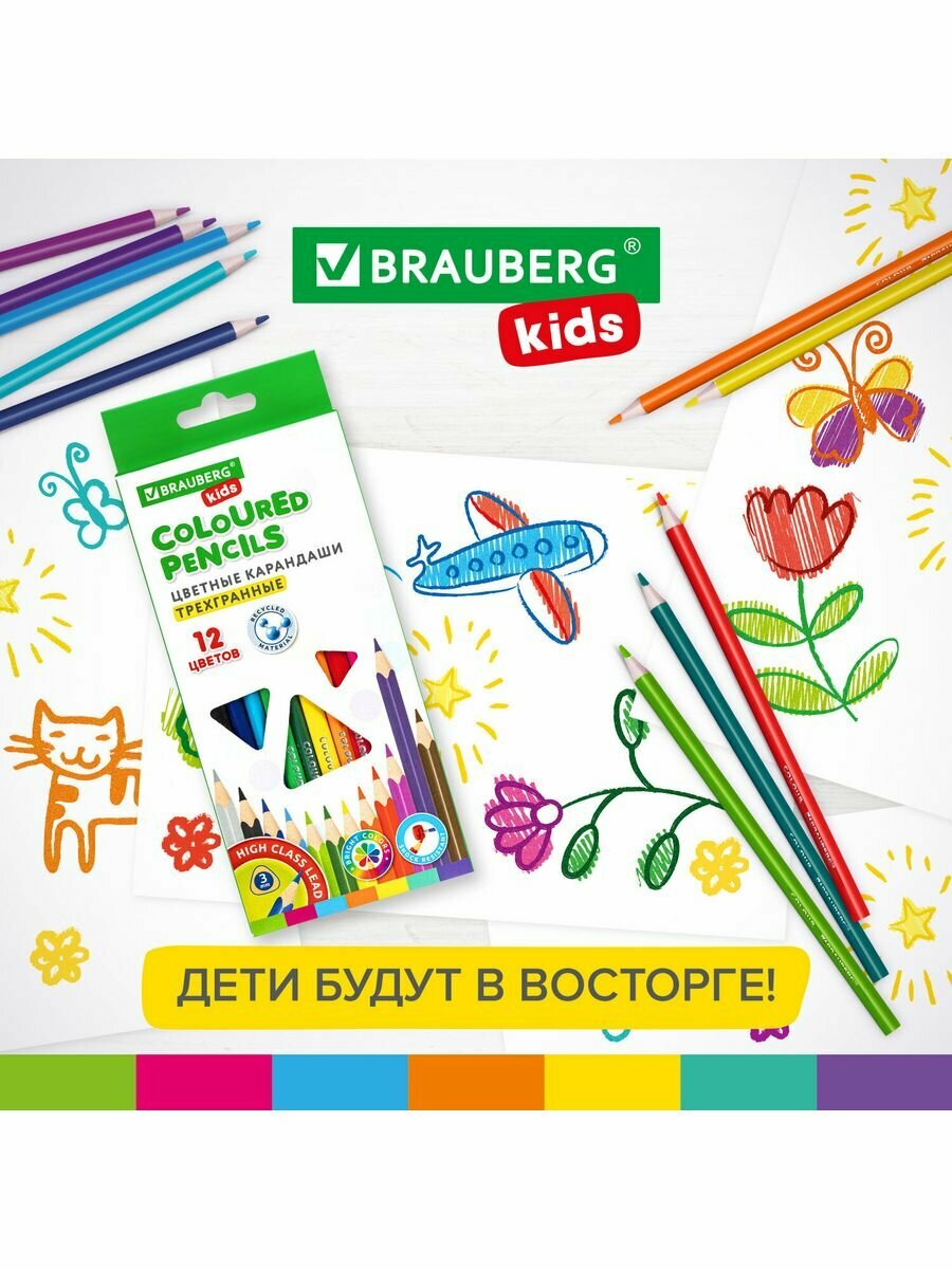 Карандаши цветные BRAUBERG KIDS NEW, 12 цветов, трехгранные, грифель 3 мм, 182001, 182001 414 ₽