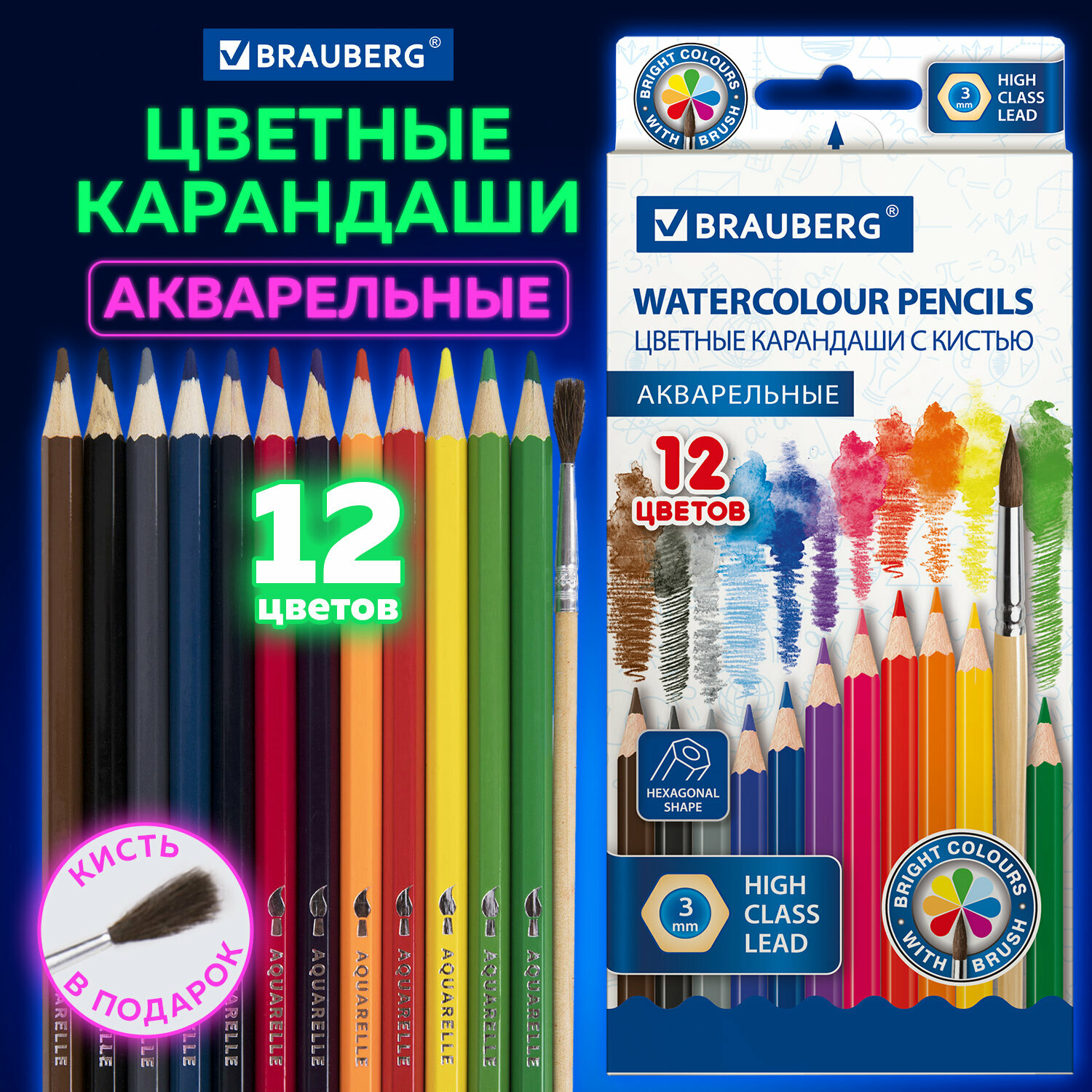 10 цен на Карандаши акварельные цветные для рисования классические мягкие Brauberg, 12 цветов, с Кистью, шестигранные, грифель 3 мм, натуральное дерево, 181848