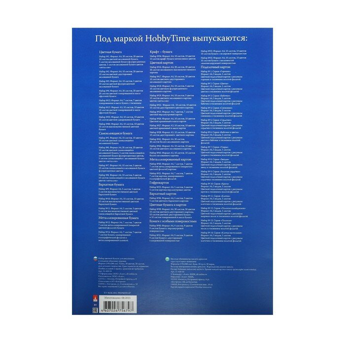 Набор цветной бумаги HOBBY TIME, А4 (222 х 352 мм), 10 листов, крашенная в массе, синий, Арт : 2-065/08