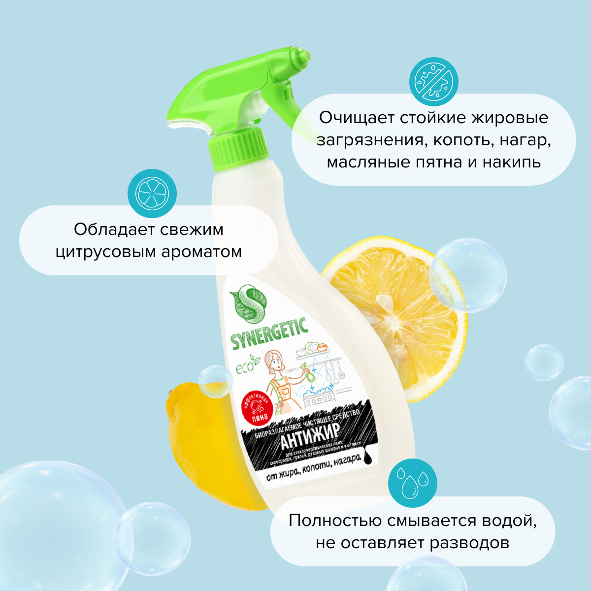 | Дополнительная информация | высокоэффективное чистящее средство "Антижир" SYNERGETIC с усиленной формулой предназначено для уборки кухонных поверхностей от стойких жировых загрязнений, копоти, нагара, масляных пятен и накипи., предназначено для стеклокерамических, металлических, эмалированных плит и поверхностей, сковородок, противней, кастрюль, шампуров, решёток-гриль, пароконвектоматов, микроволновок, вытяжек, духовых шкафов, каменных столешниц, керамической плитки и других кухонных поверхностей, обладает свежим цитрусовым ароматом благодаря гипоаллергенной парфюмерной композиции с эфирными маслами мандарина, лемонграсса, лимона, апельсина и перечной мяты., средство устраняет неприятные запахи, эффективно даже в холодной воде, полностью смывается, не оставляя разводов, средство подходит для уборки в детских учреждениях, оно также безопасно для септических установок., попадая в среду септика, оно "понятно" для микроорганизмов и без труда распадается на простые соединения. |