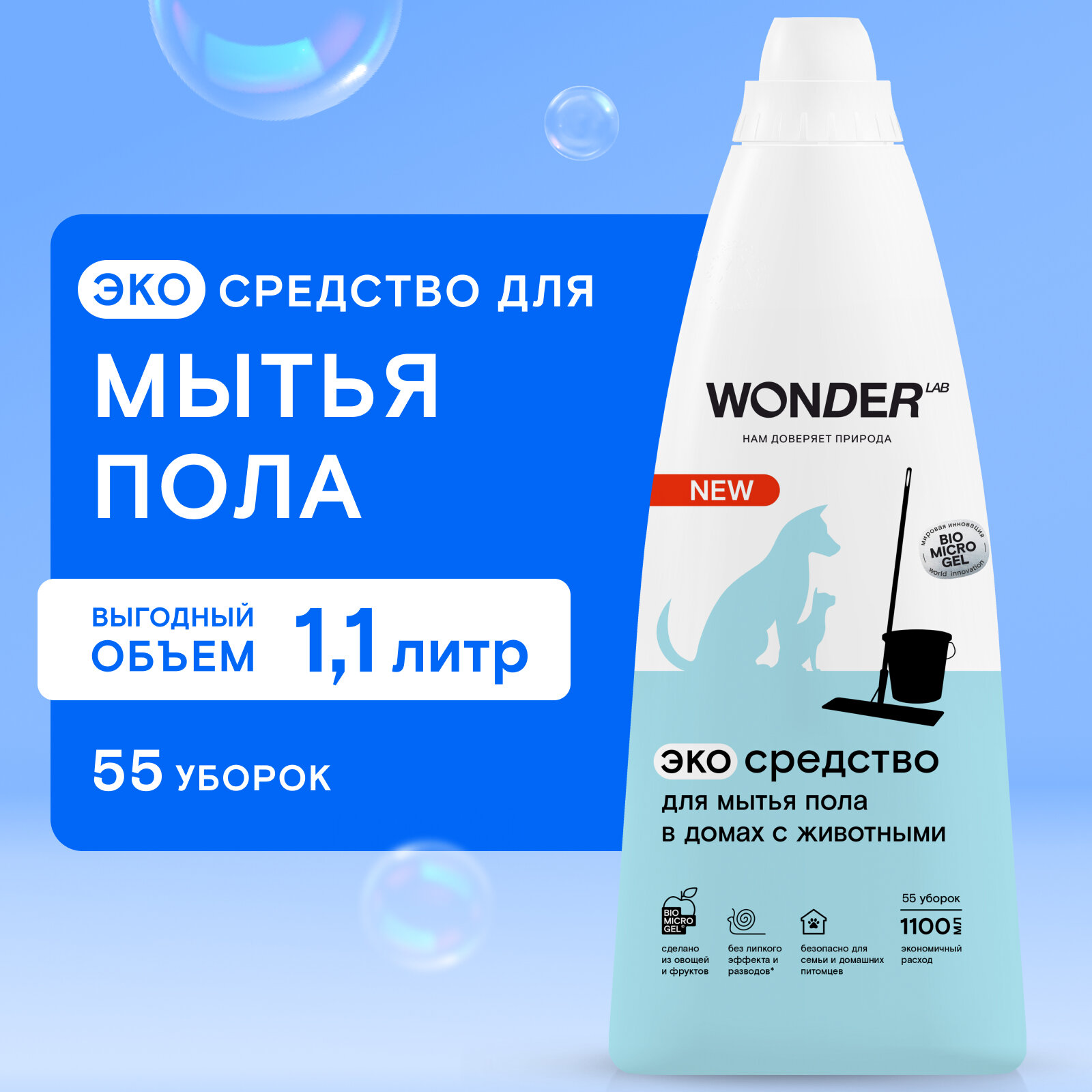 Жидкое эко средство для мытья пола в домах с животными WONDER LAB с нейтральным ароматом, концентрированное, 1100 мл информация: