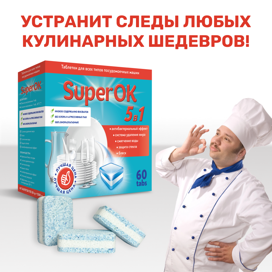 Таблетки для посудомоечной машины SuperOK 5в1 / 60 шт. информация: