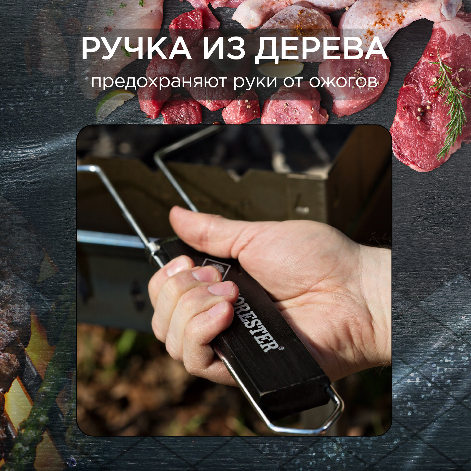 Решетка Forester Решетка - гриль, для мангала, FORESTER 26*38 см объемная большая, нержавеющая сталь с ручками из каучукового дерева