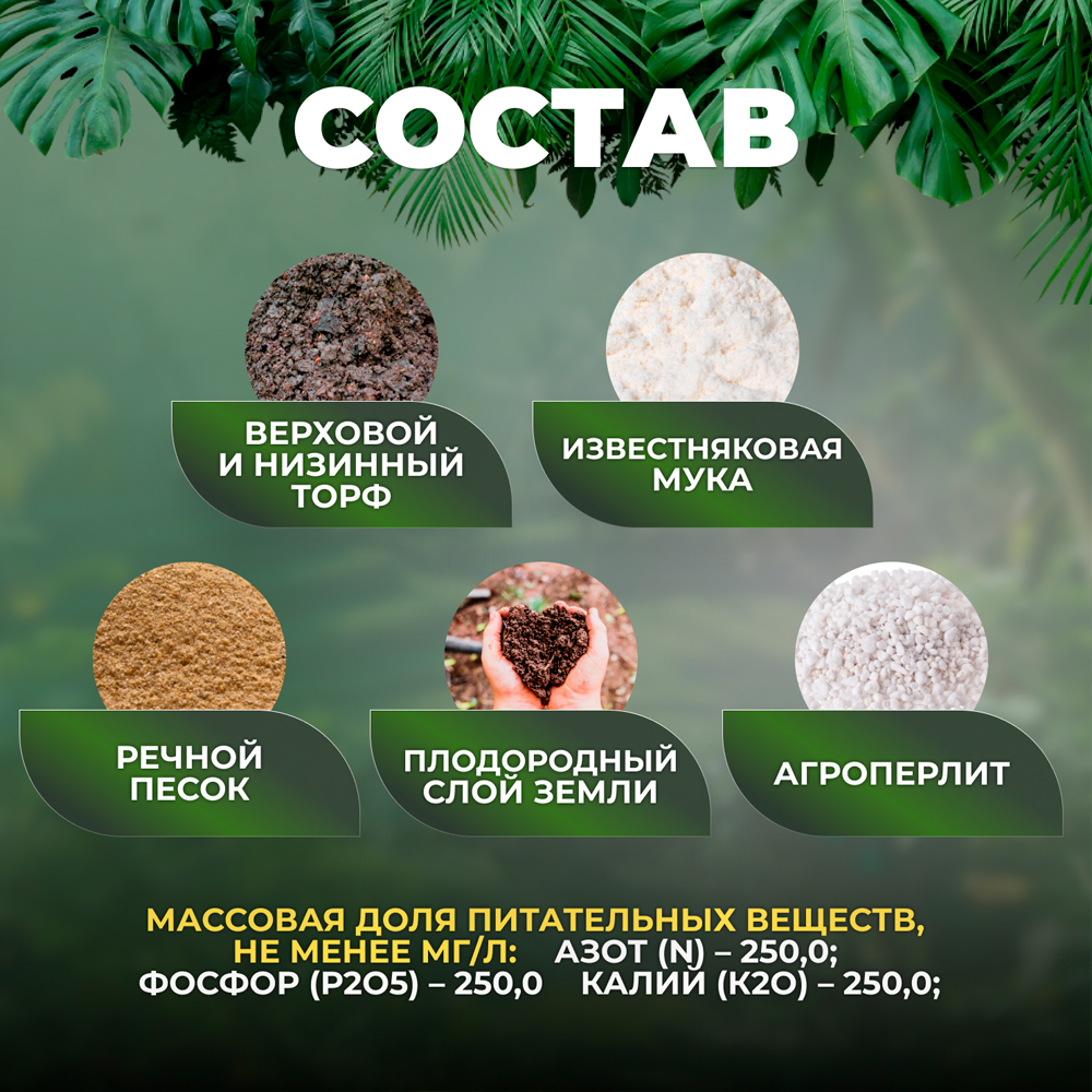 | Состав | Грунт для замиокулькаса, антуриума и спатифиллума, ароидных 5 л Сила Суздаля |