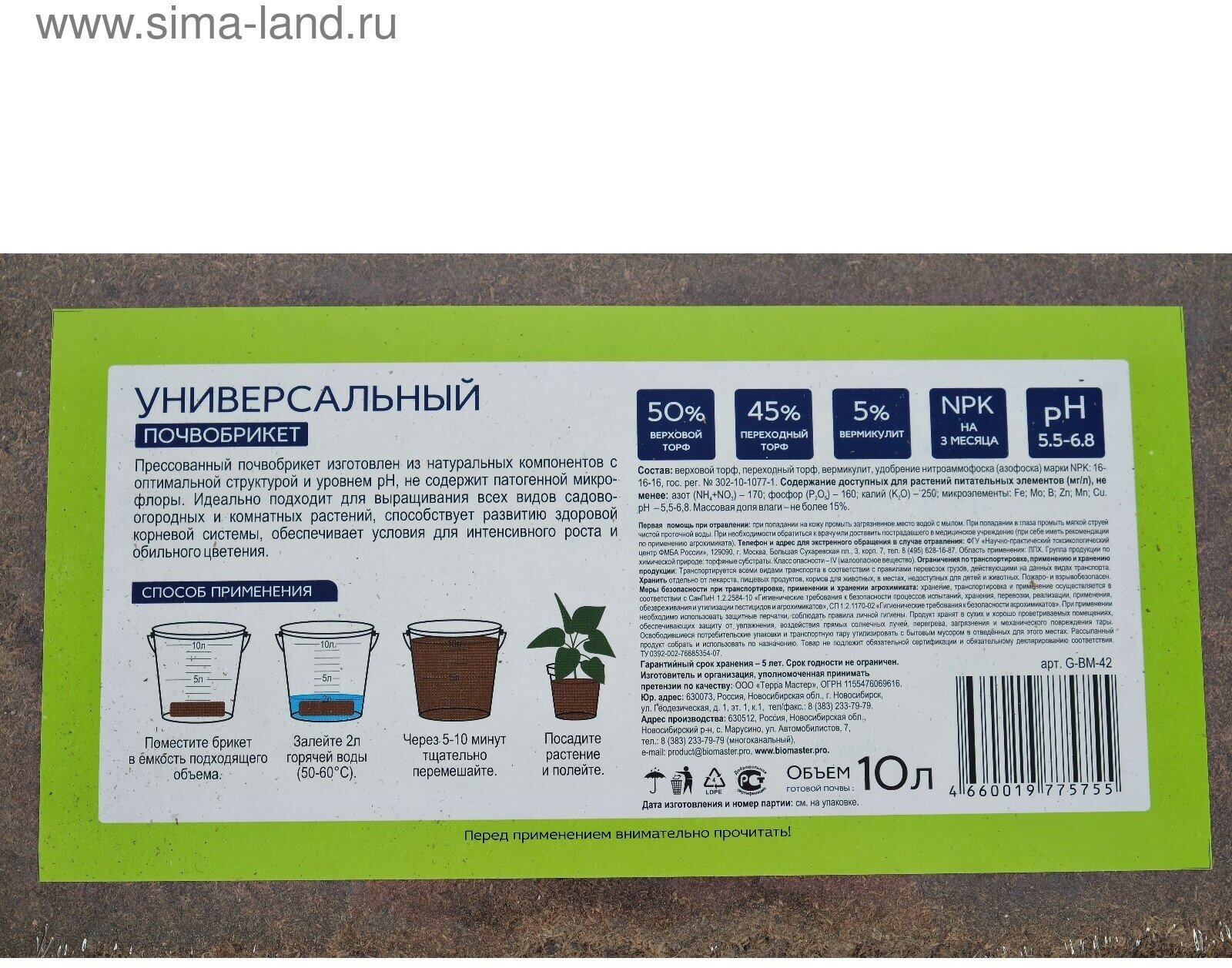 | Дополнительная информация | способ применения: Поместите брикет в емкость подходящего объема. Залейте 2 л горячей воды (50-60°С). Через 5-8 минут тщательно перемешайте. Посадите растение и полейте |