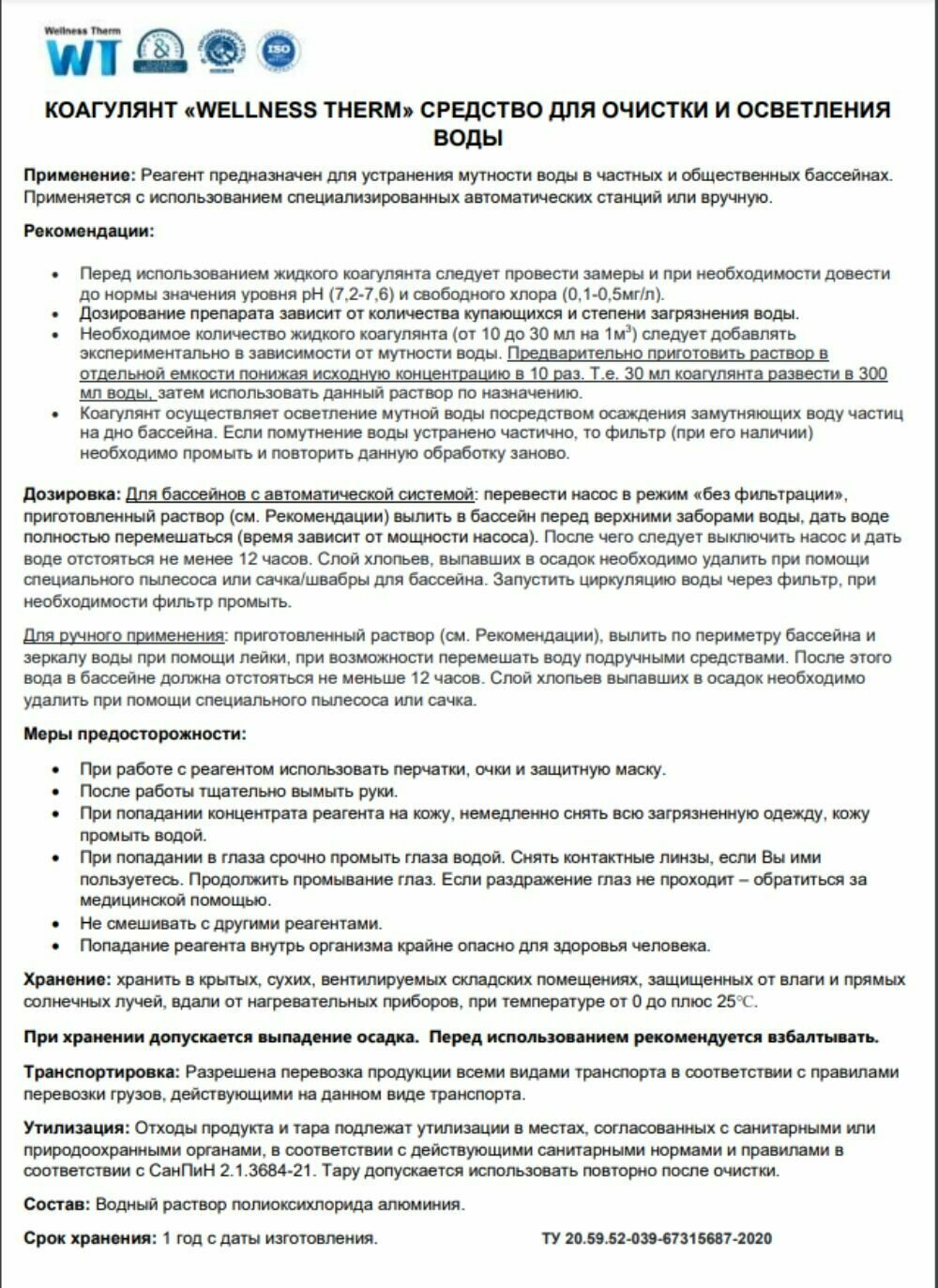 Коагулянт Wellness Therm Средство для очистки и осветления воды 1 литр . информация: