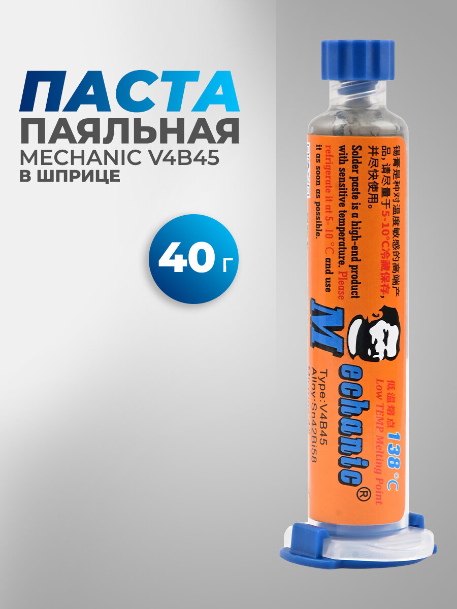 Паяльная паста низкотемпературная MECHANIC V4B45, в шприце, 40 г.,Solder Paste, Sn42Bi58, 138 C 790 ₽