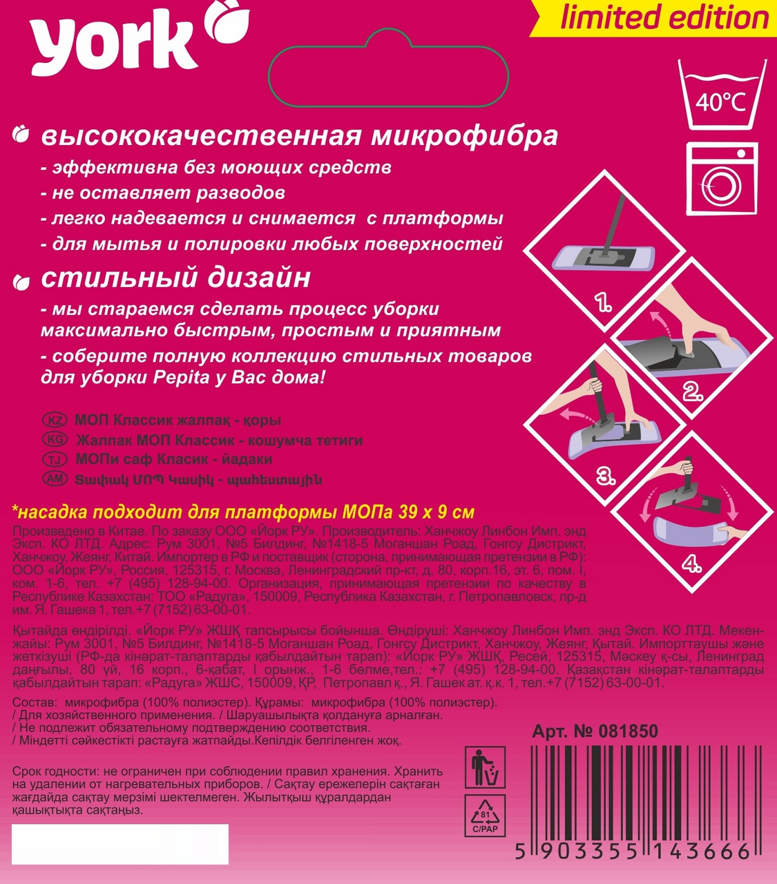 Сменный блок для швабры York Стайл классик Pepita 081850 микрофибра, прямоугольный, 42*13 черный 285 ₽