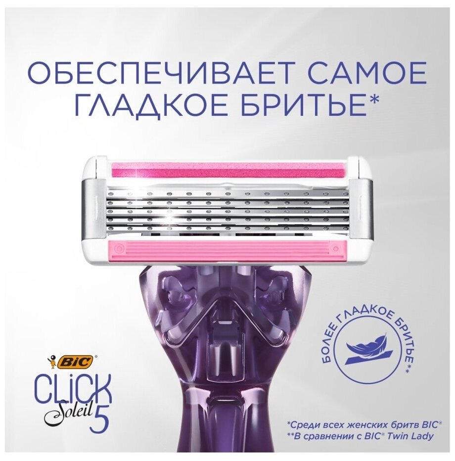 Женская бритва 3 лезвия BIC Click 5 Soleil с плавающей головкой бритвенный станок для женщин + 2 сменные кассеты с Алоэ Вера и витамином Е информация: