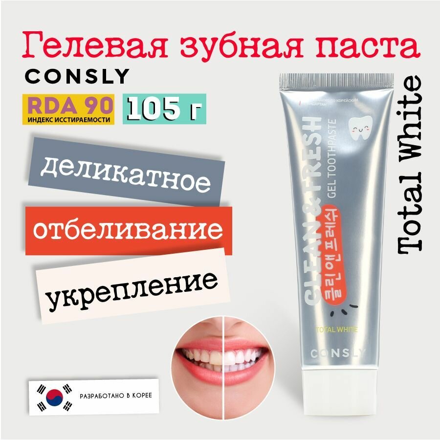 Гелевая зубная паста Consly Total White отбеливающая, с фтором, 105 г