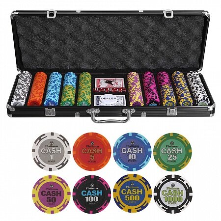 | В наборе | - 500 фишек (номинал фишек: 25 - 125 шт., 50 - 125 шт., 100 - 125 шт., 500 - 50 шт., 1000 - 50 шт., 5000 - 25 шт.); - 5 костей; - 2 колоды карт; - фишка дилера; - кейс; - ключи от кейса. |