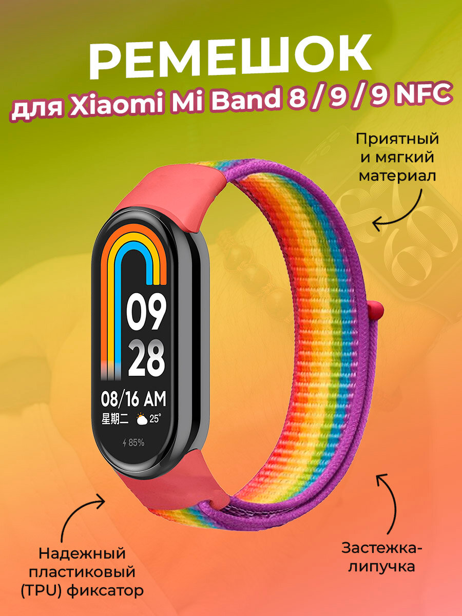 Ремешок с нейлоновой петлей на липучке для Xiaomi Mi Band 8 / 9, цвет радуги 394 ₽