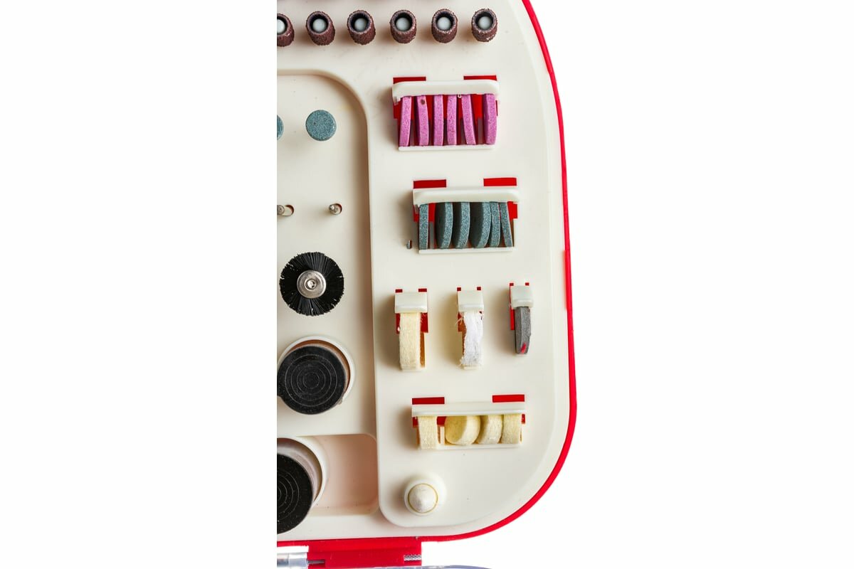 | Дополнительная информация | комплектация: оправка для полировального круга - 1 шт.; оправка для отрезного круга - 3 шт.; оправка для шлифовальных колец - 2 шт.; абразивное шлифовальное кольцо (большое) - 18 шт.; абразивное шлифовальное кольцо (малое) - 21 шт.; полировальный круг 1/2x1/4 - 4 шт.; полировальный круг 1x1/4 - 1 шт.; тряпичный полировальный круг - 1 шт.; фетровый полировальный круг - 1 шт.; прорезиненный шлифовальный круг - 2 шт.; лепестковый круг 3/8x3/4 - 1 шт.; шлифовальный лист - 60 шт.; отрезной абразивный круг 1 мм - 30 шт.; отрезной абразивный круг 0.8 мм - 36 шт.; полировальная паста - 2 шт.; отрезной круг из стекловолокна - 5 шт.; фигурная шарошка - 8 шт.; фрезерное сверло - 2 шт.; hss сверло - 6 шт.; шлифовальный круг - 18 шт.; абразивное шлифовальное кольцо - 12 шт.; правильный камень - 1 шт.; цанга - 4 шт.; латунная кордщетка - 3 шт.; стальная кордщетка - 3 шт.; нейлоновая кордщетка - 3 шт.; ключ - 1 шт. |