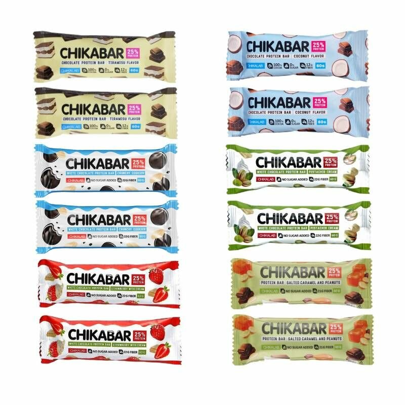10 цен на Протеиновый батончик Chikalab Chikabar Без сахара глазированный с начинкой 60 грамм, Ассорти: Тирамису, Кокос, Печенье, Клубника, Фисташка, Арахис (12 шт.)