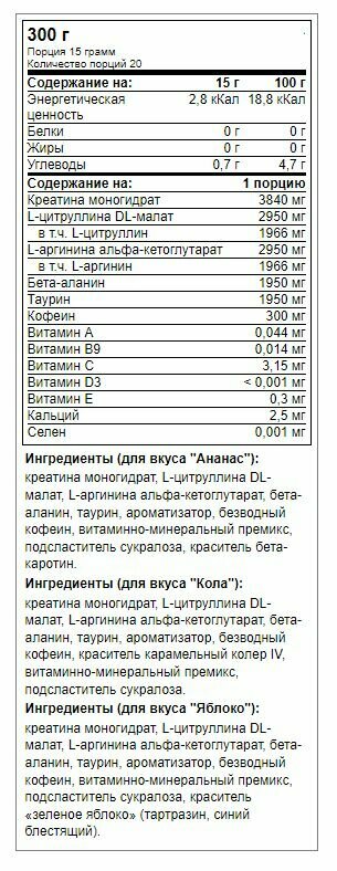| Основные ингредиенты | аргинин / бета-аланин / витамины и минералы / кофеин / креатин / таурин |